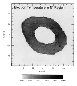 Here is the temperature map presented in the publication. The temperature is roughly homogeneous in the ring of the nebula, averaging 9600 K. (N + electronic temperature map obtained by N.J. Lame et al.)