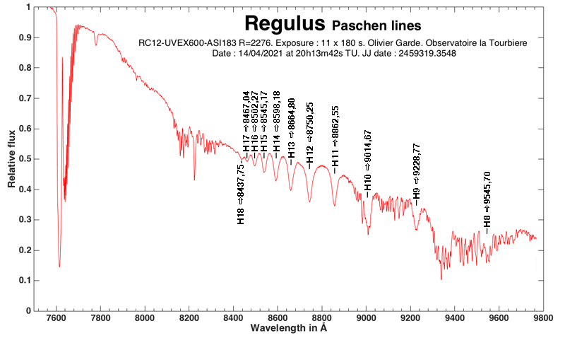 And here’s the spectrum graph of Regulus. We could have obtained the Paschen line # 7 at 10.049.4 Å, and maybe # 6 at 10.938.1 Å if the spectrum had been centered a little more to the right on the red side.